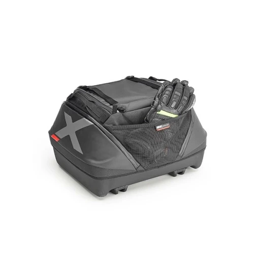 De to romslige side-lommene er lett tilgjengelige, og for å øke tilgjengelig plass har XL08 toppkofferten doble stropper på den øvre delen for å sikre ekstra last, for eksempel hvis man ønsker å ha en softshell-jakke eller regnutstyr innen rekkevidde.
